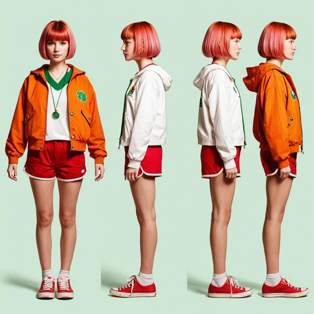 Score_9, score_8_up, score_7_up, score_6_up, (CharacterSheet:1), 1girl, pink short hair, orange jacket, red shorts, bangs, white shirt, green pendant, red shoes, green eyes, simple white background, dynamic pose, sexy, reference sheet, (full body, from side, front:1.1), upper body, cartoon