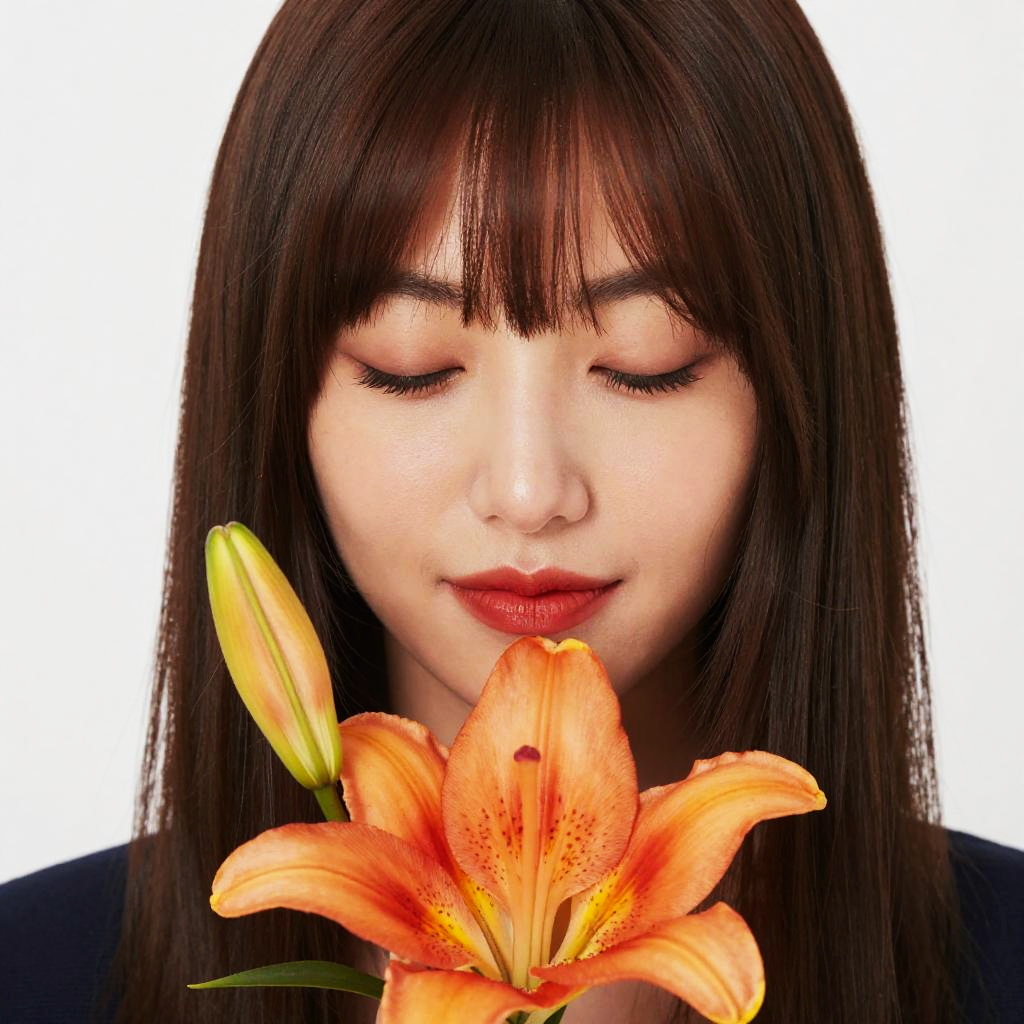 Photograph of a woman with straight, dark brown hair and bangs, closed eyes, and red lipstick, gently holding an orange lily with yellow accents and speckled details near her face. She has light skin and wears a dark top. Her expression is peaceful and content. The background is white, making the vibrant flower and her face stand out.