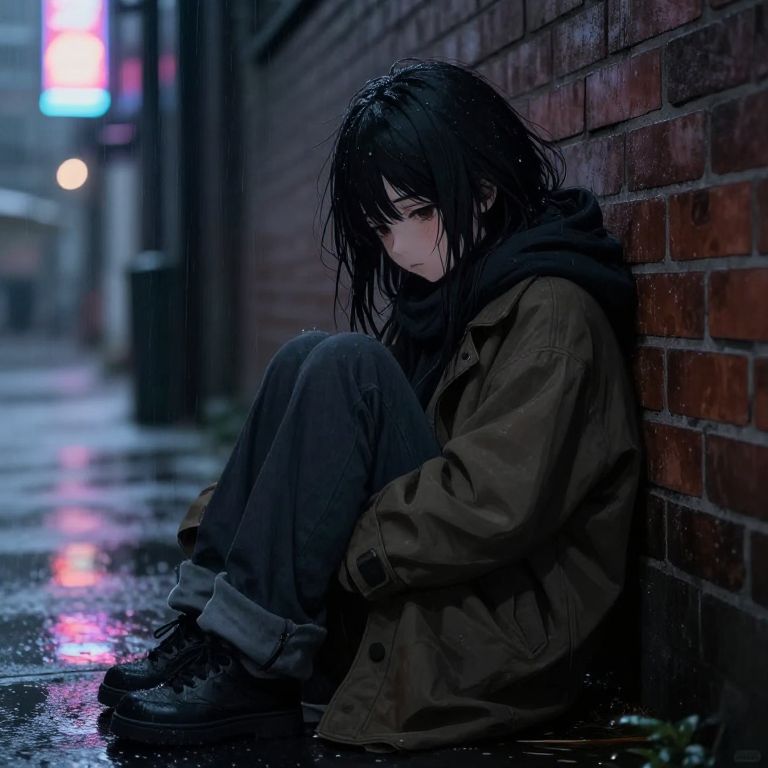 Homeless anime girl with messy hair and oversized coat, curled up against a cold brick wall in an urban alley, rain falling softly nearby, neon signs flickering, capturing a blend of melancholy and resilience, digital painting.