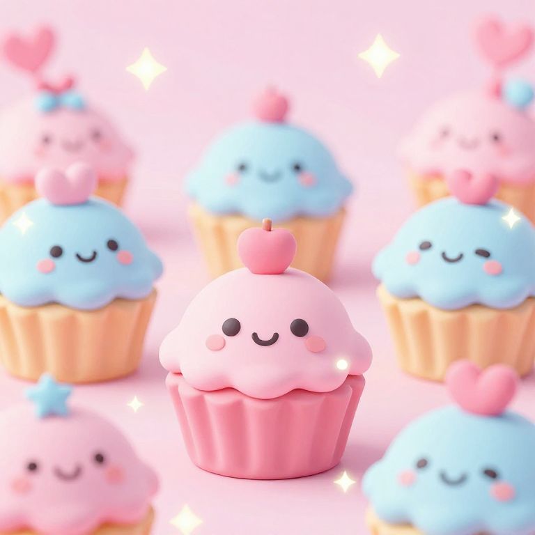 Kawaii:lv1hds_e28a= inspired scene featuring smiling cupcakes with smiling faces, pink and baby blue tones, kawaii style with rounded shapes, twinkling lights effect, magical and sweet candyland environment