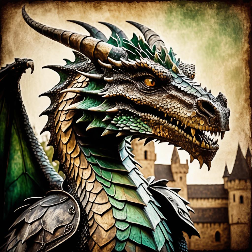 Detailed close-up of a medieval dragon featuring bruised turquoise and green scales, metallic armor plates, and sharp horns. The image exudes a whimsical fairy tale vibe with a grunge, impasto technique and sepia filter enhancing the burnt brown and green tones. Atmospheric lighting highlights the dragon's textured skin and fiery orange eyes against a blurred medieval stone background.