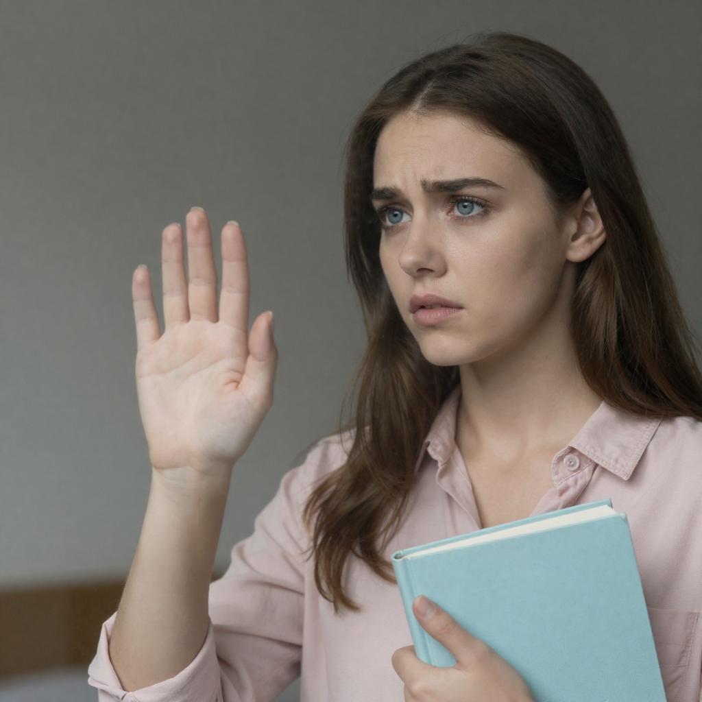Photograph of a young woman with long brown hair, light skin, and blue eyes. She wears a pink shirt, pressing her hand against a glass door with visible scratches. She holds a book in her other hand, looking concerned. Dimly lit background.