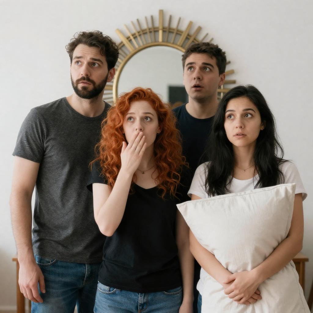 Three adults standing in a doorway with a wooden door and purple walls in the background. The woman in the middle has curly hair, wears a floral dress, and is pointing to the right with an intense expression. The man on the left has dark hair, a black t-shirt, and gray shorts with his arms crossed, showing a neutral expression. The woman on the right has short black hair, a white tank top, and a yellow and white striped skirt, also with arms crossed and a neutral expression.