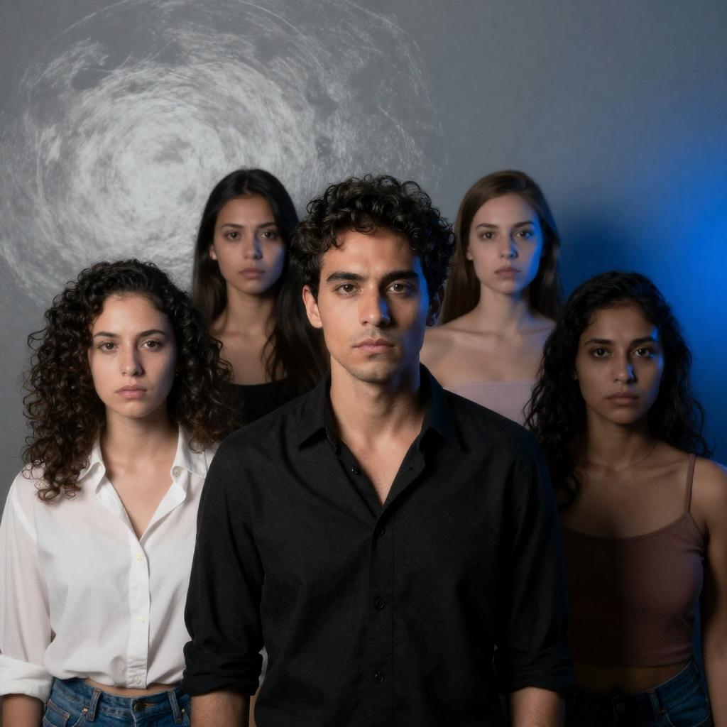 Photograph of three people in a doorway. Middle woman with curly hair, floral dress, pointing right, intense expression. Left man with dark hair, black t-shirt, gray shorts, arms crossed, neutral expression. Right woman with short black hair, yellow and white striped skirt, white tank top, arms crossed, neutral expression. Background includes a partially open door and purple wall.