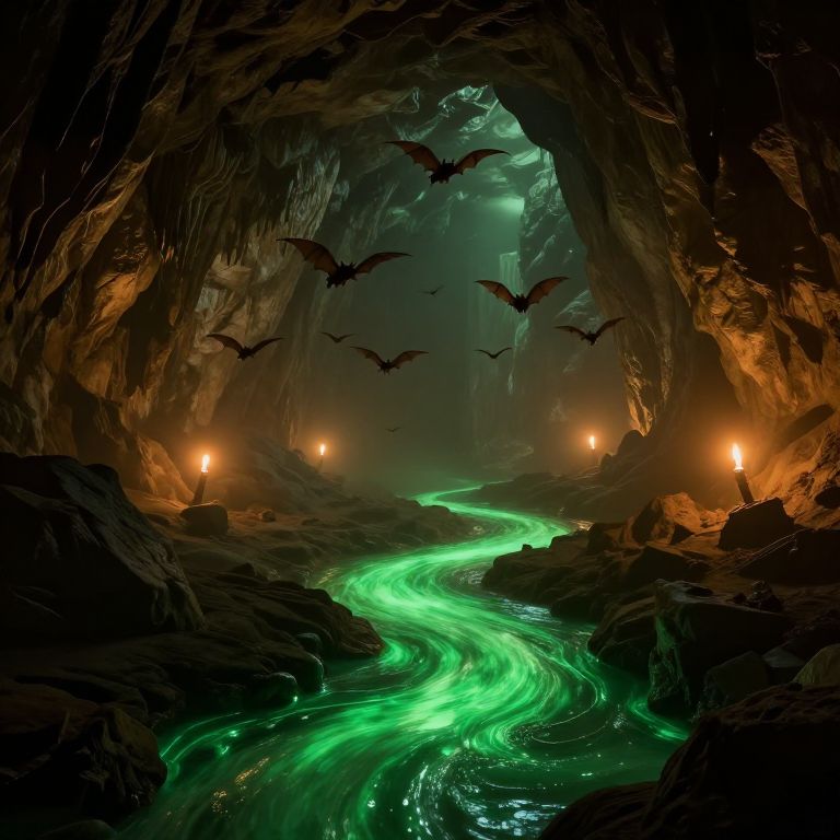 "High-Poly huge underground cavern with hundreads of bats flying, torch lights seen from afar, rivers of green glowing goo,"