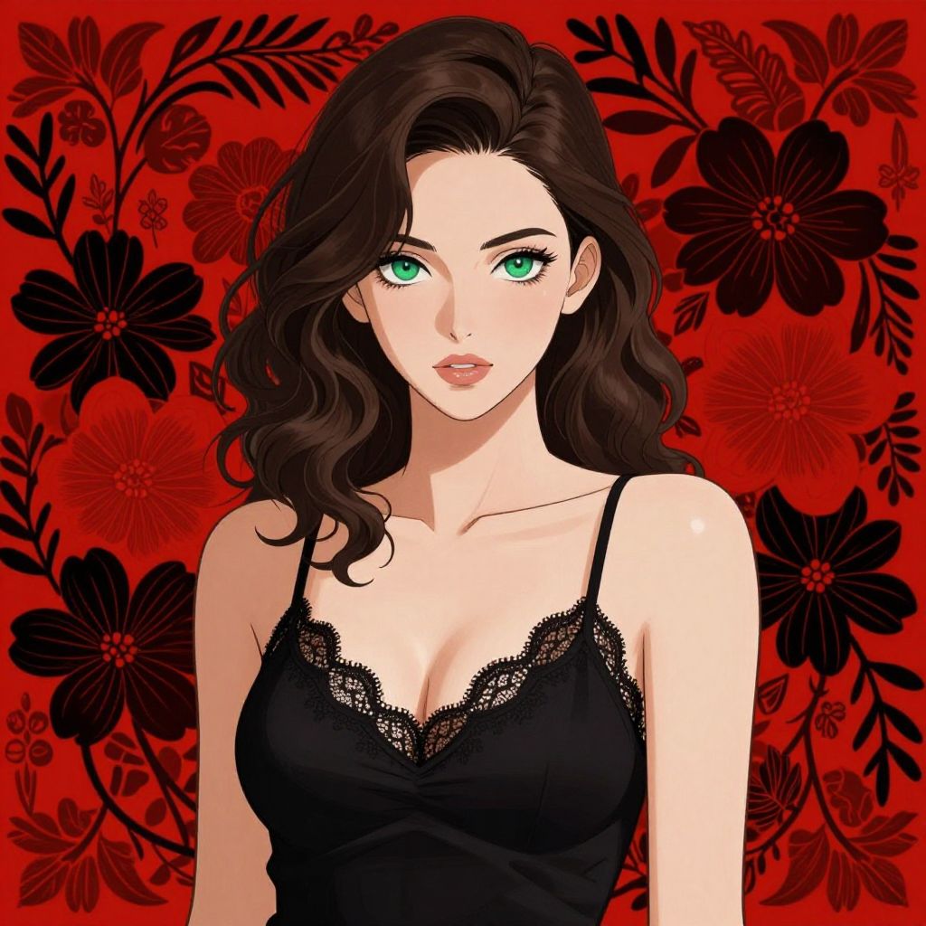 This digital illustration features a beautiful woman with fair skin and striking green eyes, looking directly at the viewer. She has wavy, dark brown hair and is wearing a black, lace-trimmed camisole that reveals a hint of cleavage. The background is a vibrant, intricate pattern of red and black flowers and foliage, creating a striking contrast with her outfit. Her expression is neutral, with slightly parted lips. The style is anime-inspired, with clean lines and vivid colors.
