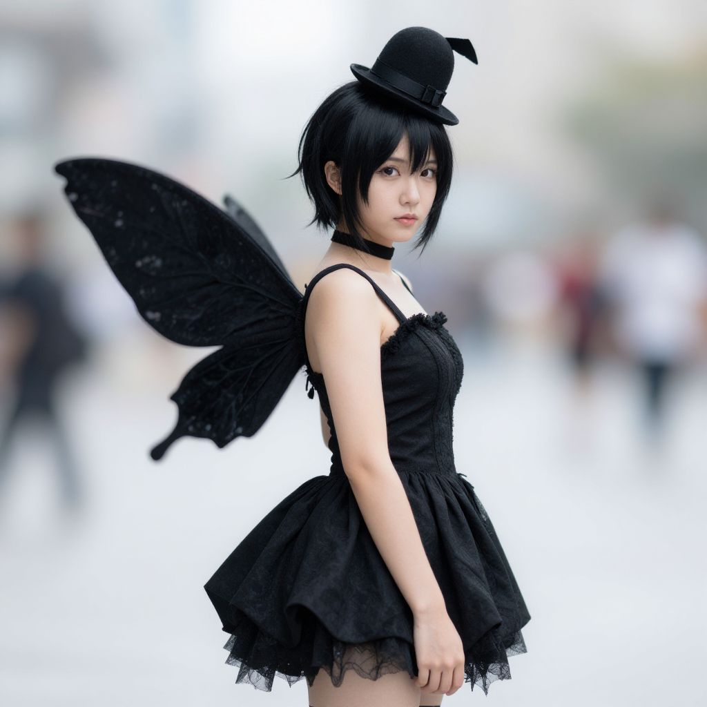 Black pixie costume, 1girl, solo, wings, dress, black hair, insect wings, looking at viewer, blurry background, hat