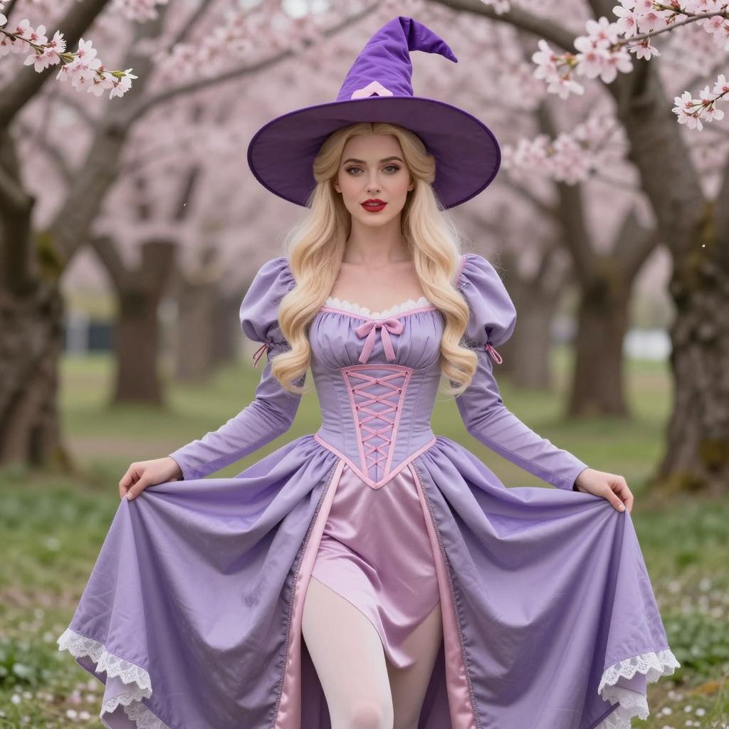 Photorealistic image of a woman wearing a lavender and pink witch costume with puffed sleeves and a corseted bodice. She has long wavy blonde hair and fair skin, with red lipstick. She is holding the sides of her dress and wearing a large purple pointed witch hat. The background features a magical forest setting with blooming pink cherry blossom trees and green grass under soft sunlight.
