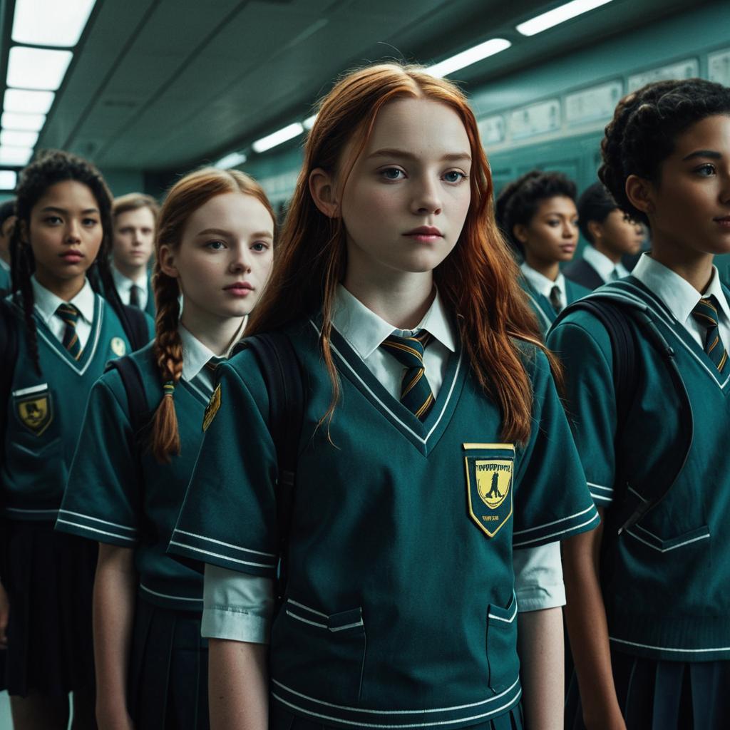 Gryffindor uniform female, photorealistic, medium close-up, red-haired girl, long wavy hair, Hogwarts uniform, grey blazer with red and gold trim, maroon tie with red and gold stripes, white shirt, Hogwarts crest on chest, serious expression, outdoor background, blurry stone building, another blonde girl in background, daylight, slightly overcast, soft shadows, detailed ures, realistic lighting, high-quality, digital photography style, T2I model, natural makeup, straight shoulders, formal attire