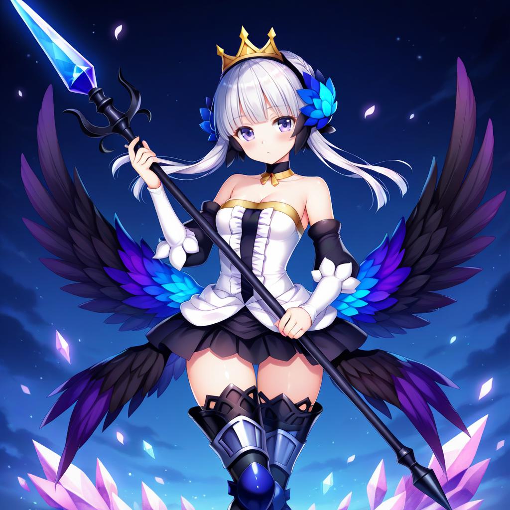 Digital artwork of a fantasy anime girl with white and grey short hair, purple and blue eyes, wearing a strapless armored dress with thigh-highs and detached sleeves. She has multicolored black, blue, and purple wings, a golden crown, and holds a long spear with a glowing blue tip. The background is a starry night sky with floating crystal shards, creating an illustrious fantasy atmosphere.
