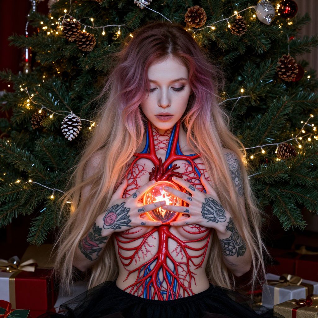The image depicts a striking and surreal scene featuring a young woman with long, flowing hair, sitting under a Christmas tree adorned with pinecones and twinkling lights. Her skin is pale, and she has a delicate, coquettish expression. The most striking element is her chest, which is exposed to reveal a complex network of red, branching veins and arteries, resembling a tree or root system. Her hands, adorned with intricate tattoos, reach into her chest and grip her heart, which is a glowing, translucent orb with a macabre, skeletal design. The overall composition is vibrant and colorful, with a mix of warm and cool tones that create a sense of depth and contrast. The Christmas tree, with its lush green branches and festive decorations, frames the woman, adding a sense of warmth and holiday spirit to the otherwise eerie and grotesque scene.