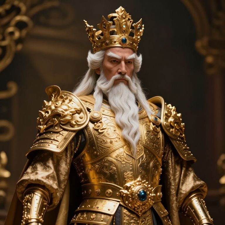 The image depicts a majestic, golden figure adorned in elaborate, ornate armor and a regal crown, exuding an aura of divine power and authority. The figure's intricate armor, featuring intricate designs and patterns, is predominantly gold, with accents of dark, rich hues that contrast beautifully against the golden tones. The crown, a masterpiece of craftsmanship, is adorned with intricate filigree and precious stones, adding to the figure's grandeur. The figure's long, flowing white beard and mustache, coupled with its stern, regal expression, further emphasize its divine status. The background is dark, allowing the figure to stand out prominently, with a subtle, ethereal glow that enhances the divine and otherworldly quality of the scene. The overall composition is balanced, with the figure centrally positioned, drawing the viewer's attention immediately to its grandeur and majesty.