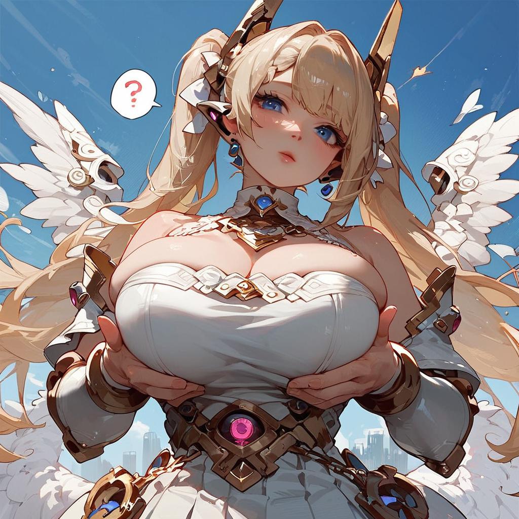 Score_9, score_8_up, score_7_up, score_6_up, angel in hell surrounded by demons, magic particles, cleavage, white hair, scared, curvy, huge breasts, narrow waist, wide hips, thick thighs, looking at viewer, dynamic angle, cowboy shot, cartoon, dynamic pose