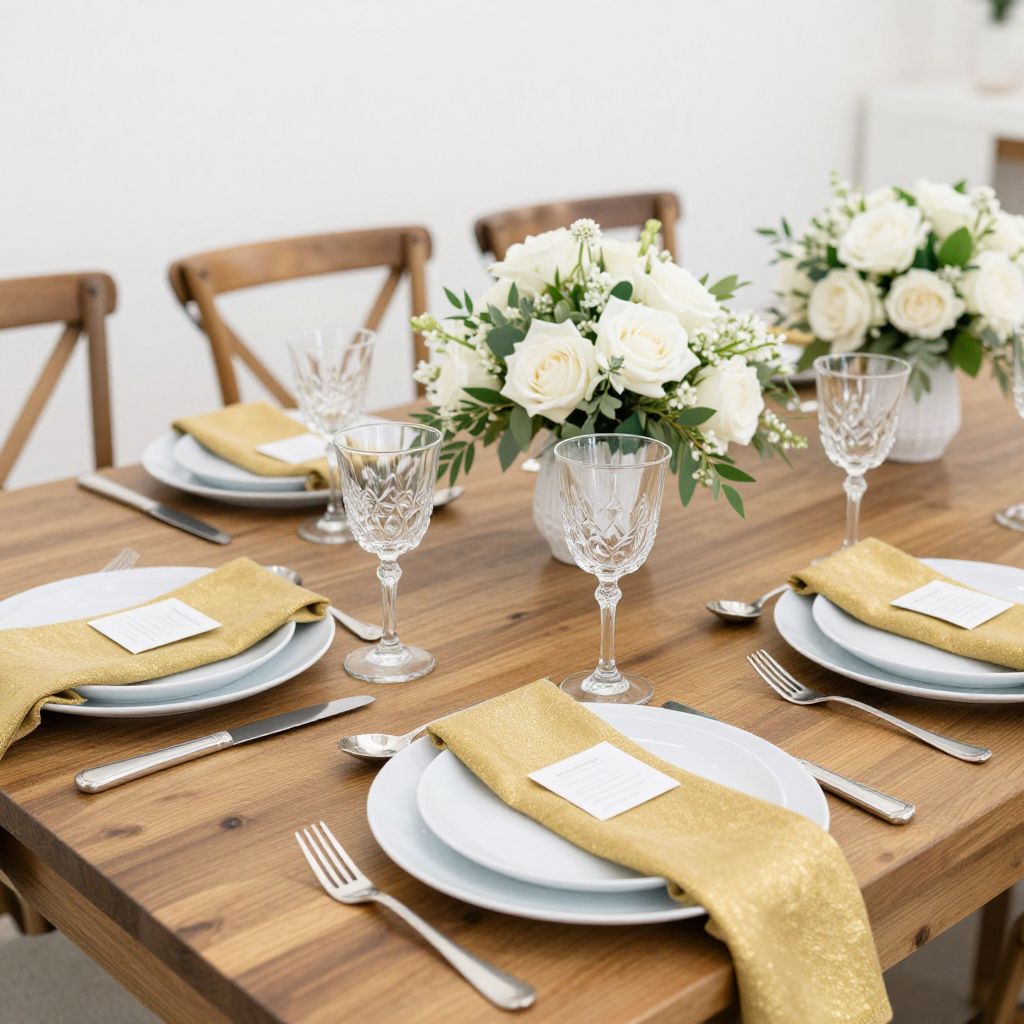 Photograph of a rustic wooden dining table set for four. Each place setting includes a white plate with a folded gold napkin, a white square card, and silverware. Crystal wine glasses with intricate cuts are placed at each setting. Centerpieces consist of white roses and greenery in glass vases, adding a touch of elegance. The wooden chairs have a simple, rustic design. The background is a plain white wall, keeping the focus on the table setting. The overall style is elegant yet rustic, with a warm, inviting color palette.