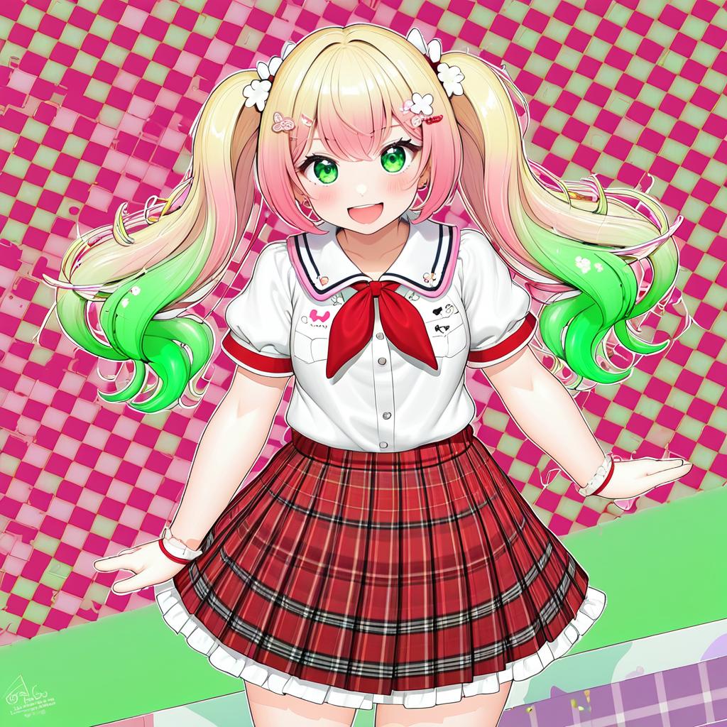 Momosuzu nene (casual), hololive, 1girl, fang, green eyes, blonde hair, official alternate hairstyle, gradient hair, pink hair, long hair, official alternate hair length, medium hair, twintails, hair flower, hairclip, red skirt, plaid skirt, pleated skirt, long sleeves, virtual youtuber, virtual youtuber, red neckerchief, miniskirt, by artist unsfrau, anime