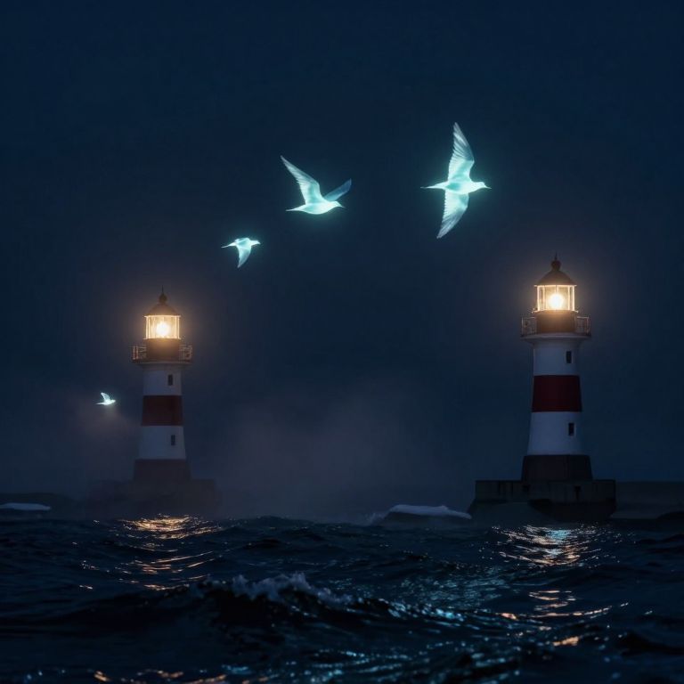 Photograph of a dark, moody night scene featuring two illuminated lighthouses standing in choppy, reflective ocean water. The lighthouses, painted in alternating red and white stripes, emit a warm, yellow glow from their tops. Two ethereal, glowing white birds with translucent wings are flying above the lighthouses, their luminescence contrasting against the deep blue, misty background. The scene is atmospheric, with the lighthouses and birds creating a mystical, almost magical effect. The water reflects the lighthouses' light, adding a shimmering texture to the foreground.