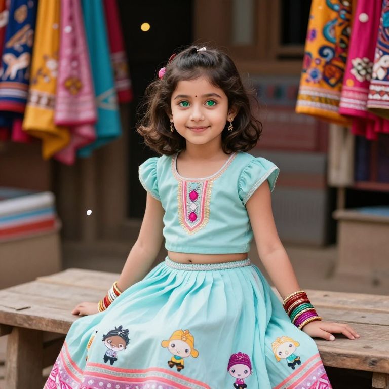 A cheerful 12-year-old girl with large, bright green eyes and a smooth complexion dressed in a pastel-colored girlish lehenga featuring cute cartoon-style motifs, sitting on a wooden bench in a village market with colorful bangles and hand-painted fabrics floating around her.