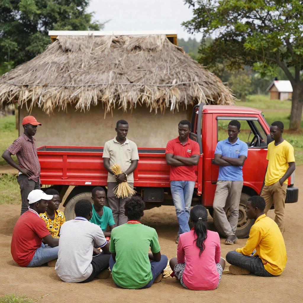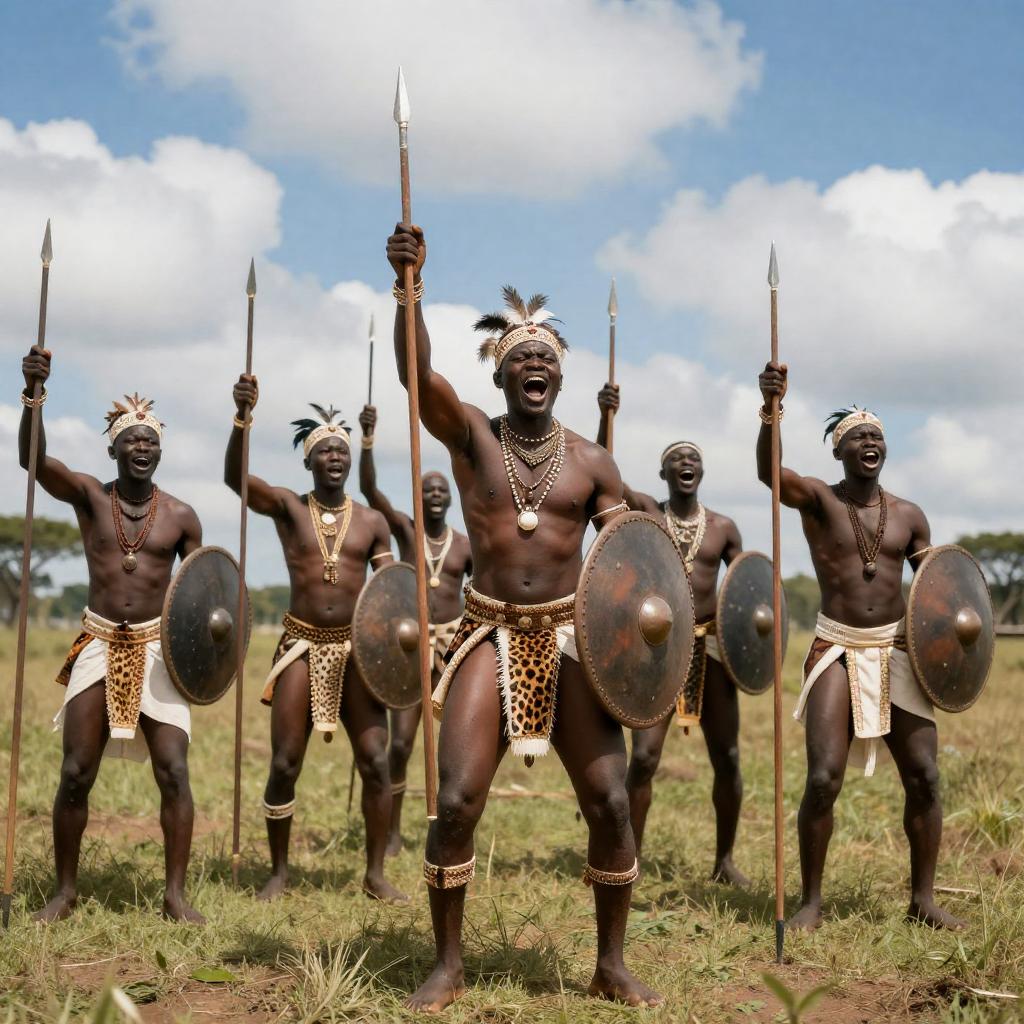 Group of 17 African men and women standing in front of a thatched-roof hut. Wearing colorful wrap skirts and bare-chested. Orange sandy ground. Large metal pot on left. People's backs facing camera. Neutral facial expressions. Warm lighting.