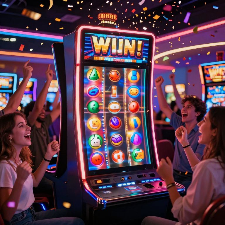 Photograph of a lively casino scene with three excited young adults celebrating at a brightly lit "WIN" slot machine, surrounded by colorful confetti and neon
