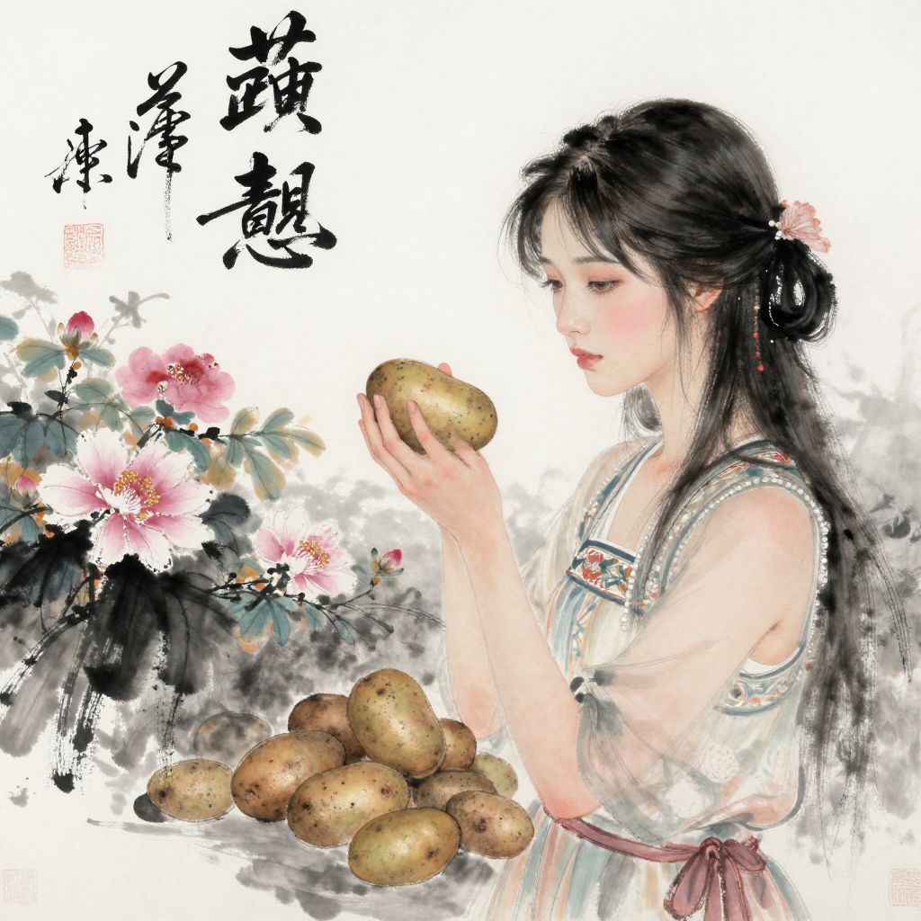 Digital painting of an East Asian woman with long black hair tied in a ponytail, wearing a traditional white and pink kimono with floral patterns. She holds a potato in both hands, examining it closely. In front of her, there is a pile of potatoes. The background features a watercolor-style splash of pink flowers and dark green leaves on the left. Chinese calligraphy in black ink is on the top left. The woman's expression is focused and serene. The style is delicate and detailed, with a soft, pastel color palette.