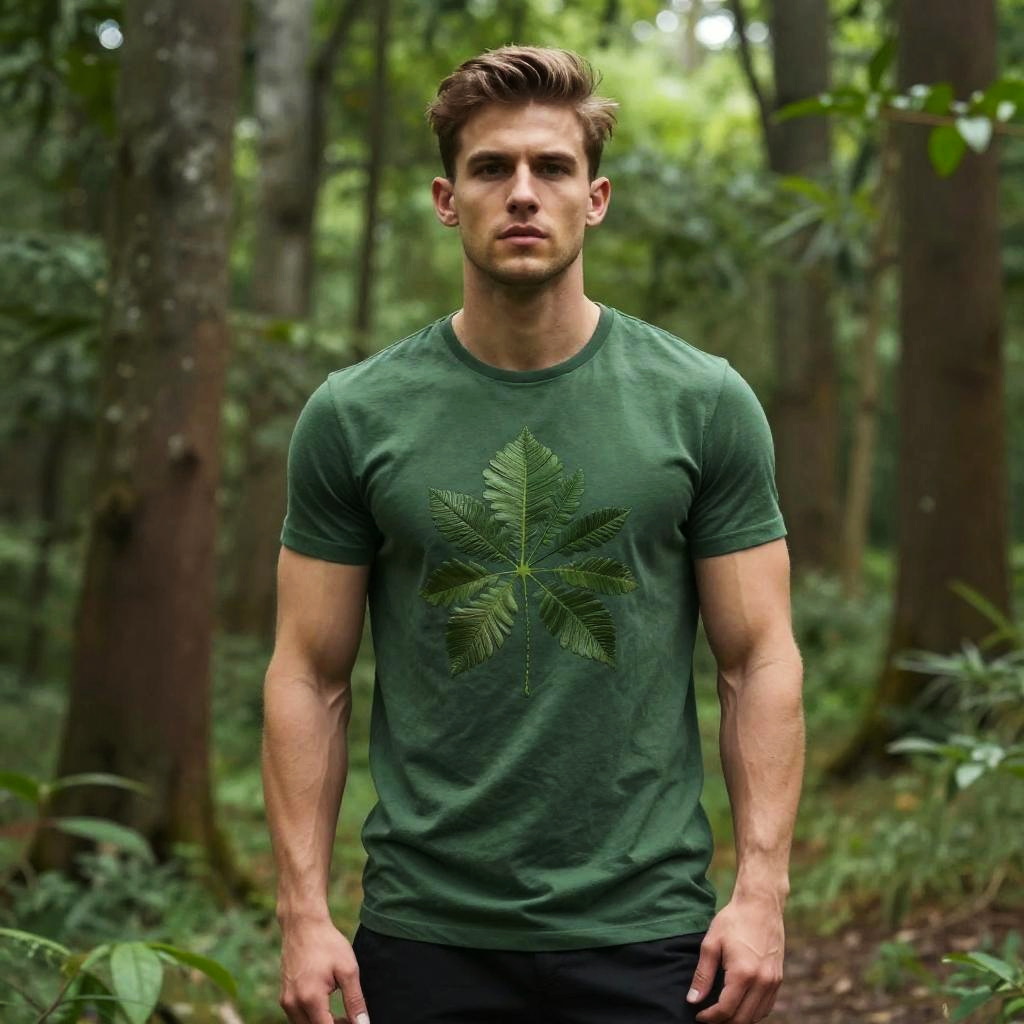 A young man stands confidently in a lush green forest, wearing a green t-shirt with a prominent leaf design on the front. The natural light filters through the trees, highlighting his strong physique and focused expression, creating a serene and empowering outdoor atmosphere.