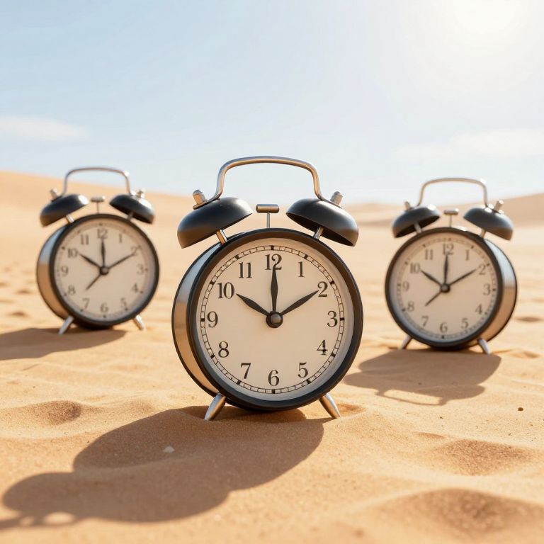Rustic vintage alarm clocks stand solemnly in a sunlit desert landscape, their hands frozen in time as they cast long shadows, evoking a surreal, high-definition 3D-rendered scene where time seems suspended amidst the golden sands.