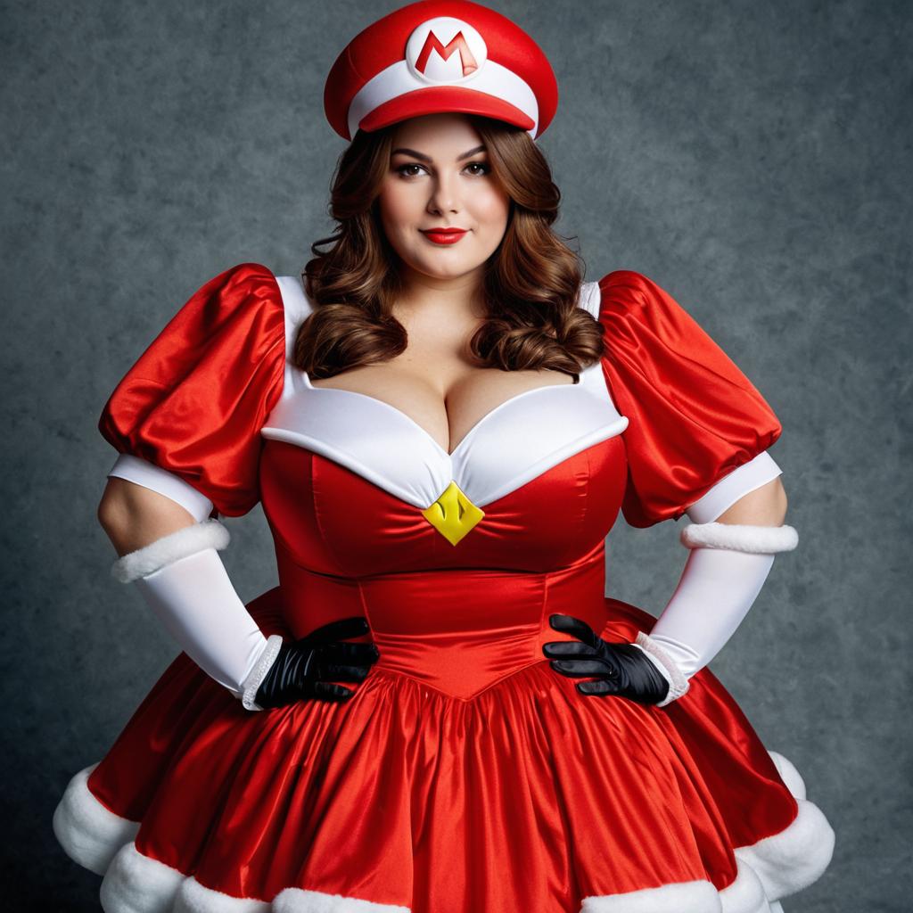 A plus size woman with brown long hair wearing a vibrant red and white Mario-inspired costume. The outfit features a red dress with puffy short sleeves, white gloves with fur trim, and a matching red Mario-style hat with an 'M' emblem. She has black gloves underneath the white gloves, red lipstick, and is posing with her hands on her hips against a gray textured background.
