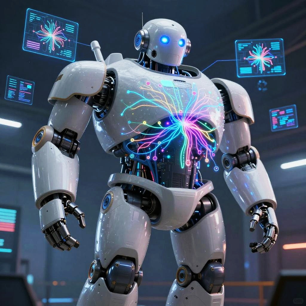 Disney AI characters reimagined as futuristic androids in a vibrant cyberpunk cityscape, glowing neon lights reflecting on sleek metallic surfaces, expressive digital eyes, intricate circuits, showcasing a blend of classic animation charm and advanced technology, highly detailed.