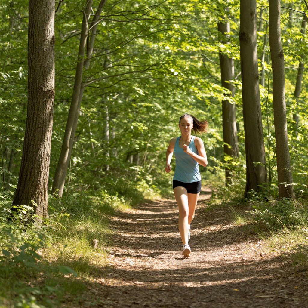 Athletic woman jogging energetically along a sunlit forest trail, surrounded by towering trees and vibrant greenery.