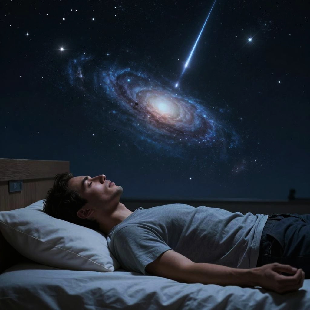 A young man lying flat on a bed, meditating with eyes closed. Above him, a highly detailed and realistic celestial night sky filled with stars, a spiral galaxy, and a vivid shooting star streaking across. The scene conveys a spiritual and dreamy atmosphere with dramatic lighting and ultra-realistic 8k quality rendering.
