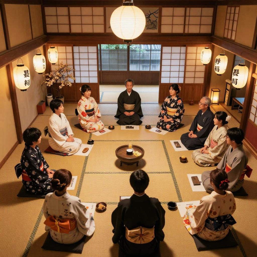 Yokozuwari view from above showing a group of people seated in yokozuwari style during a seasonal festival inside a spacious ryokan room, intricate tatami mats, hanging lanterns casting soft glows, detailed traditional decorations and vibrant festival kimonos.