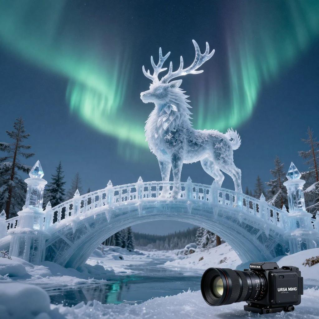 Aurora-glazed kirin, crystalline antlers and frost mane perched in suspended ice-cathedral bridge arcing over a frozen chasm beneath dancing aurora skies. Shot on Blackmagic URSA Mini Pro 12K with 50mm anamorphic lens, (hyperdetailed), 8K HDR, dramatic lighting, cinematic atmosphere.