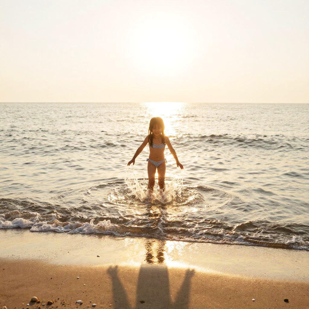 Little girl in bikini holding a starfish on a rocky shore, gentle sea breeze blowing, turquoise ocean waves crashing softly, bright sunlight illuminating her smile, detailed textures of rocks and marine life, peaceful and explorative seaside moment