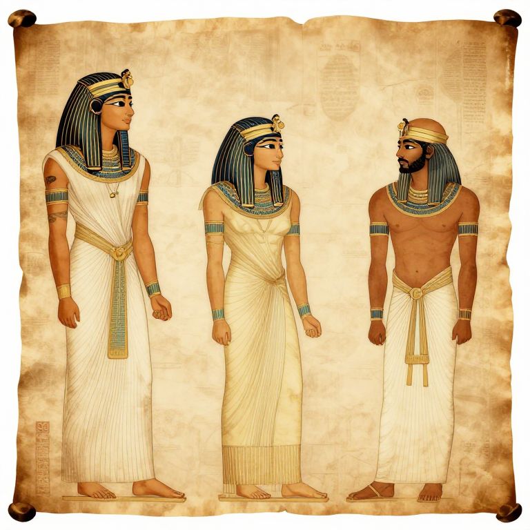 This digital illustration depicts three ancient Egyptian figures standing side by side against a parchment-like background. All three have dark skin, black wavy hair, and wear traditional Egyptian headgear with blue and gold accents. The two figures on the left are dressed in white, pleated linen dresses with golden sashes, arm bands, and anklets. The figure on the right is shirtless, revealing a muscular torso, and wears a white kilt with a golden sash and similar arm bands and anklets. The background features faded hieroglyphs, enhancing the ancient theme. The figures are depicted in a realistic yet stylized art style, reminiscent of ancient Egyptian tomb paintings.