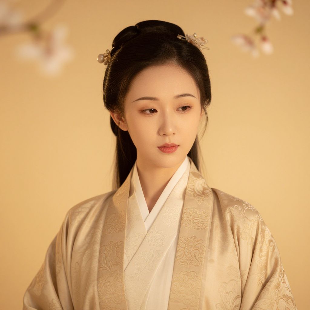 Tang Yue portrait, traditional Chinese attire, serene expression, intricate silk patterns, soft golden lighting, cherry blossom background, delicate brushstroke style, harmonious and calm atmosphere, elegant composition with subtle warm tones.