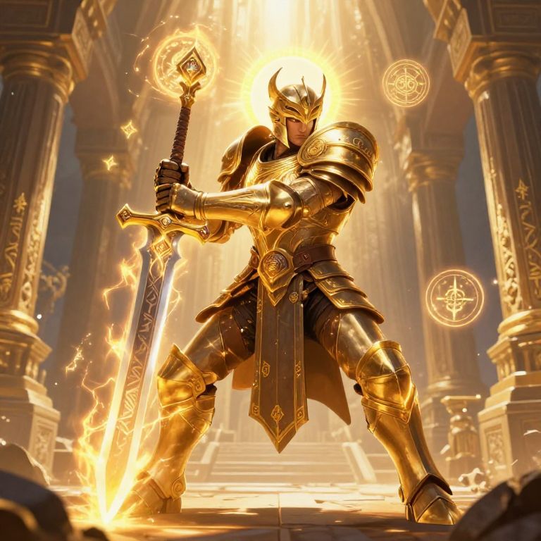 A digital illustration depicts a powerful, armored warrior standing in a radiant, golden-lit temple. The knight, clad in intricately detailed, glowing gold armor with a horned helmet, wields a flaming sword in a dynamic, defensive stance. The background features towering, ornate pillars and glowing magical runes. The knight's armor and sword emit intense light, creating a dramatic, almost divine atmosphere. The warrior's expression is determined, and the golden hues dominate the scene, enhancing the sense of power and majesty. The overall style is fantasy art, emphasizing grandeur and otherworldly energy.