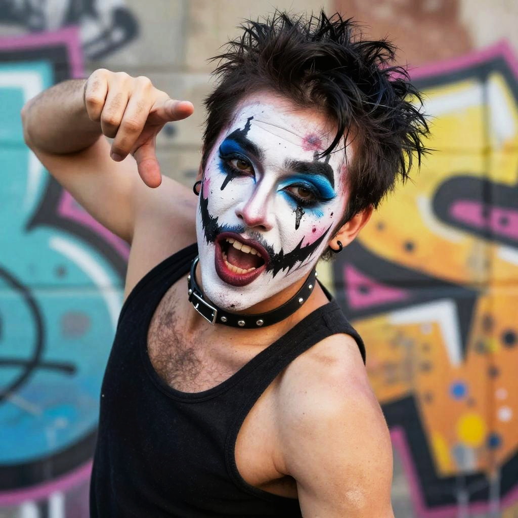 Trashy makeup cosplay character, exaggerated facial paint with bold lines and colors, intentionally messy and imperfect application, street style, dynamic pose, colorful graffiti backdrop