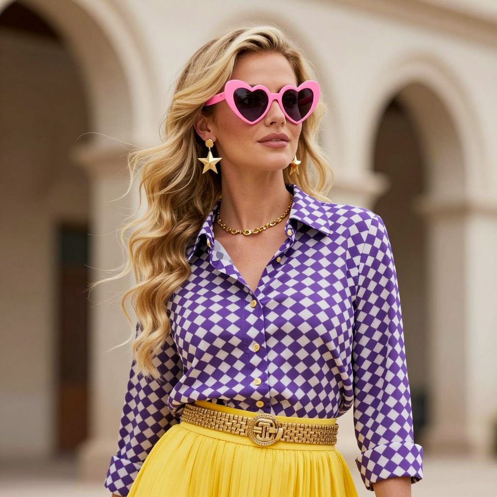Photograph of a woman with long curly blonde hair wearing heart-shaped pink sunglasses, large pink heart-shaped earrings, and a blue and orange off-shoulder top with pleated fabric. Her top is unzipped, revealing cleavage. She holds two pleated orange and blue fabric fans in front of her. She stands in a sunlit, narrow alleyway with beige walls. Her hand is on her hip, and her expression is neutral. The background includes a cobblestone ground and a white-framed window. The image has a bright, colorful style.