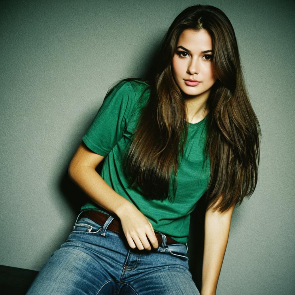 Portrait of a young woman with long brown hair and brown eyes wearing a green shirt and blue jeans. She is sitting against a gray textured wall, looking directly at the camera with a neutral expression.