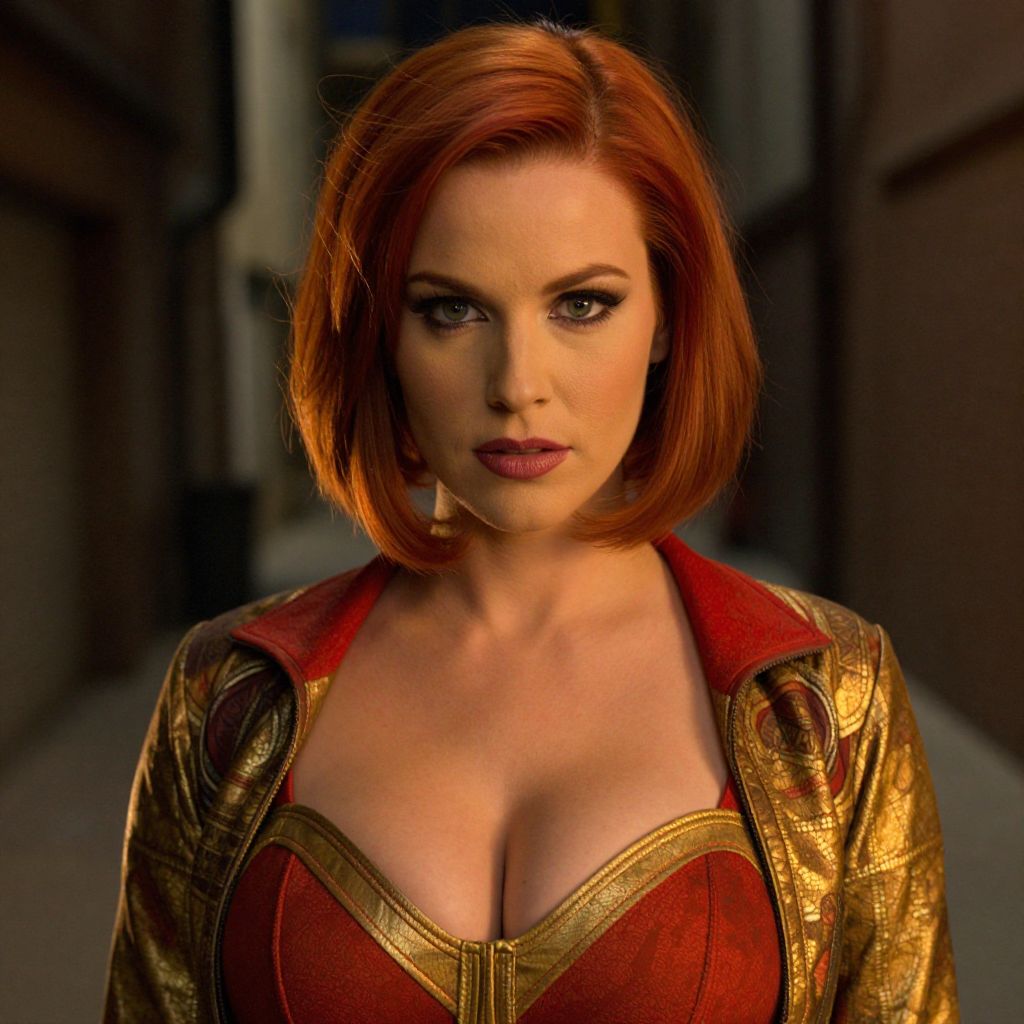 A close-up realistic photograph of a woman with a red bob haircut and a bold red bob closure hairstyle, wearing a vintage superhero costume with a red and gold pattern, standing in a dimly lit city alley at night, her face glowing with a warm lighting effect, expression serious and determined, detailed textures of fabric and hair showing natural skin tone and realistic hair strands.. The woman has big tits and cute face
