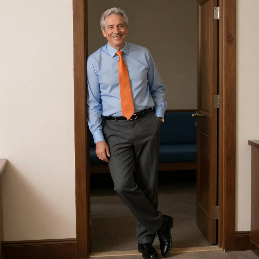 Photograph of a smiling middle-aged man with light skin and short gray hair, wearing a light blue dress shirt, orange tie, and dark gray pants, standing in a wooden doorway. He leans casually with one hand in his pocket, wearing black shoes. The background shows a dimly lit room with a blue cushioned bench.