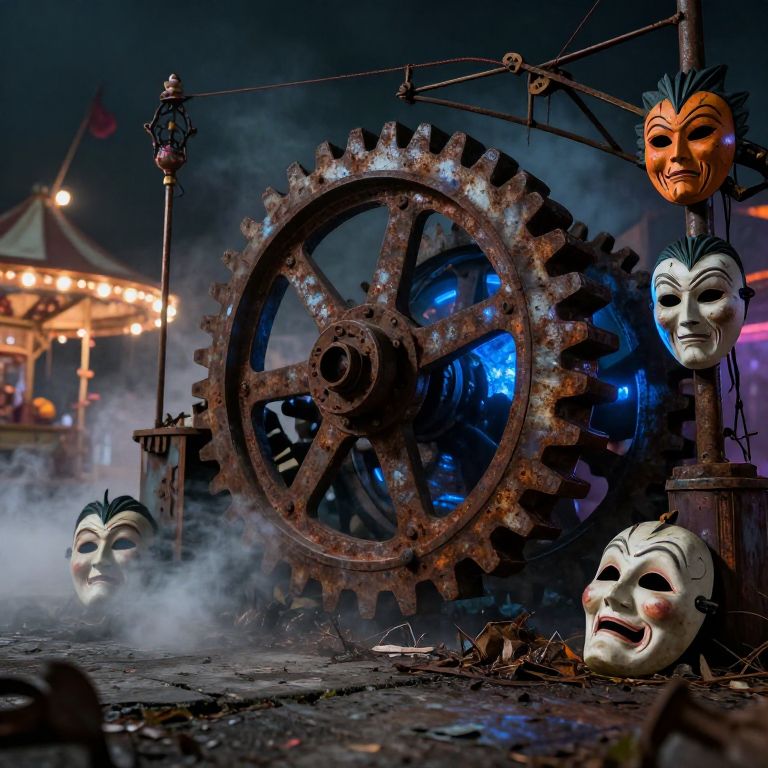 Haunted Halloween generator in a creepy abandoned carnival, rusty gears turning with eerie blue light, surrounded by dilapidated decorations and twisted carnival masks, fog rolling over cracked pavement, atmospheric horror scene with rich color palette and detailed textures