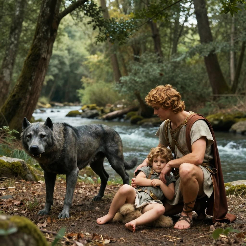 Romulus and Remus, the twin brothers suckled by the she-wolf, situated in a dense forest clearing near the banks of the Tiber River, rendered in a realistic style with natural lighting and a timeless mythical atmosphere.