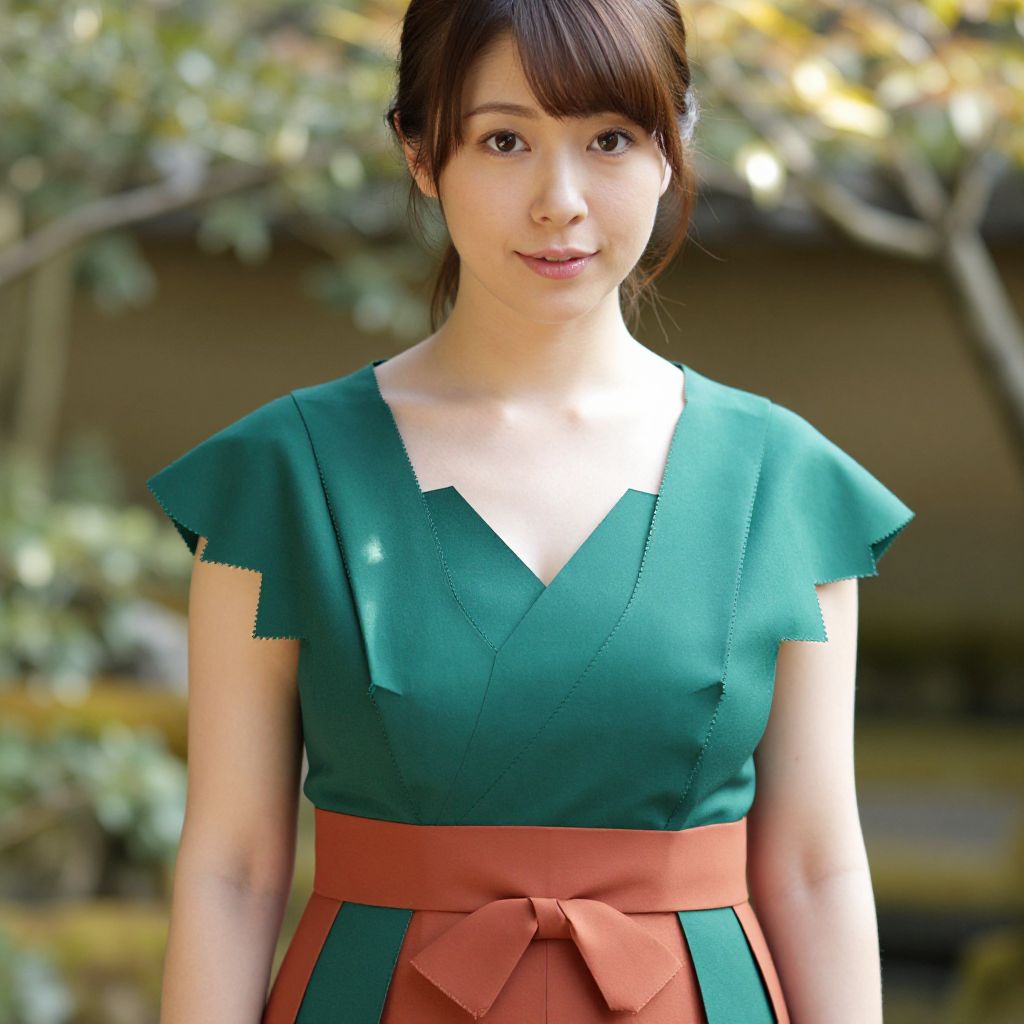 A woman with soft brown eyes and a gently defined jawline stands in a sun-dappled Japanese garden, wearing a cut-paper inspired dress with sharp, layered panels in deep emerald and terracotta, the fabric meticulously crafted to resemble folded paper with delicate geometric edges, glowing softly under natural light.. The woman has big tits and cute face