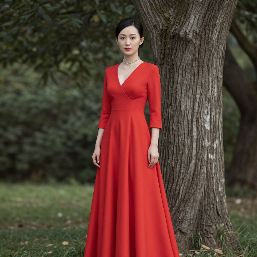 Photograph of an Asian woman standing outdoors beside a large tree with a textured bark. She has smooth, fair skin, black hair tied back, and is wearing a long-sleeved, V-neck, bright red gown that flows to the ground. She has a simple yet elegant necklace and no visible accessories. The background features a blurred, green, leafy forest and grassy ground. The lighting is natural, highlighting her dress and the tree's texture. Her expression is calm and composed. The overall style is formal and sophisticated.