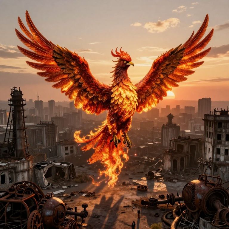 Envision a captivating digital artwork portraying an awe-inspiring phoenix emerging from the remnants in the aftermath of a vibrant medieval town's devastation, as seen from within a crumbling gothic church. The scene showcases the phoenix soaring against a vivid twilight sky, its radiant feathers juxtaposed with the haze and debris-filled environment. This image conveys both the loss of the ruined town and the hope for renewal through intricate architectural details, dynamic lighting that creates dramatic shadows, and an emotional spectrum that shifts from melancholy to optimism.