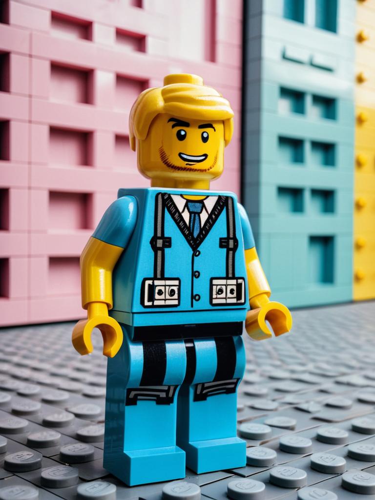 Man in Lego Pastel Building Blocks costume, photorealistic cosplay portrait, cinematic realism