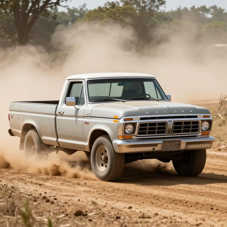 A classic Ford pickup truck races through a dusty rural track, kicking up a cloud of dirt, in a professional, photorealistic shot that captures the essence of a rugged, cinematic race.