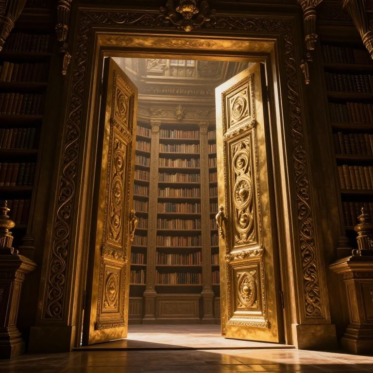 Golden, intricately carved double doors open to a dimly lit, expansive library filled with towering bookshelves, bathed in warm, ambient light