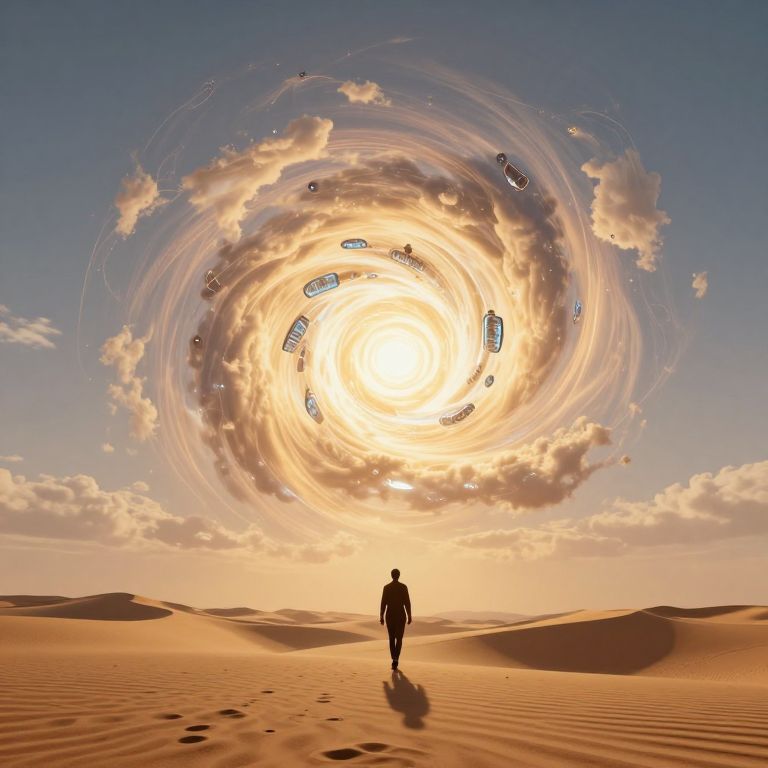 A surreal 3D-rendered desert landscape bathed in golden-hour lighting features a solitary figure walking toward a mesmerizing spiral vortex of swirling clouds and radiant light, evoking the ethereal beauty of a temporary city of glass formed by spiraling fractals of light and sound.
